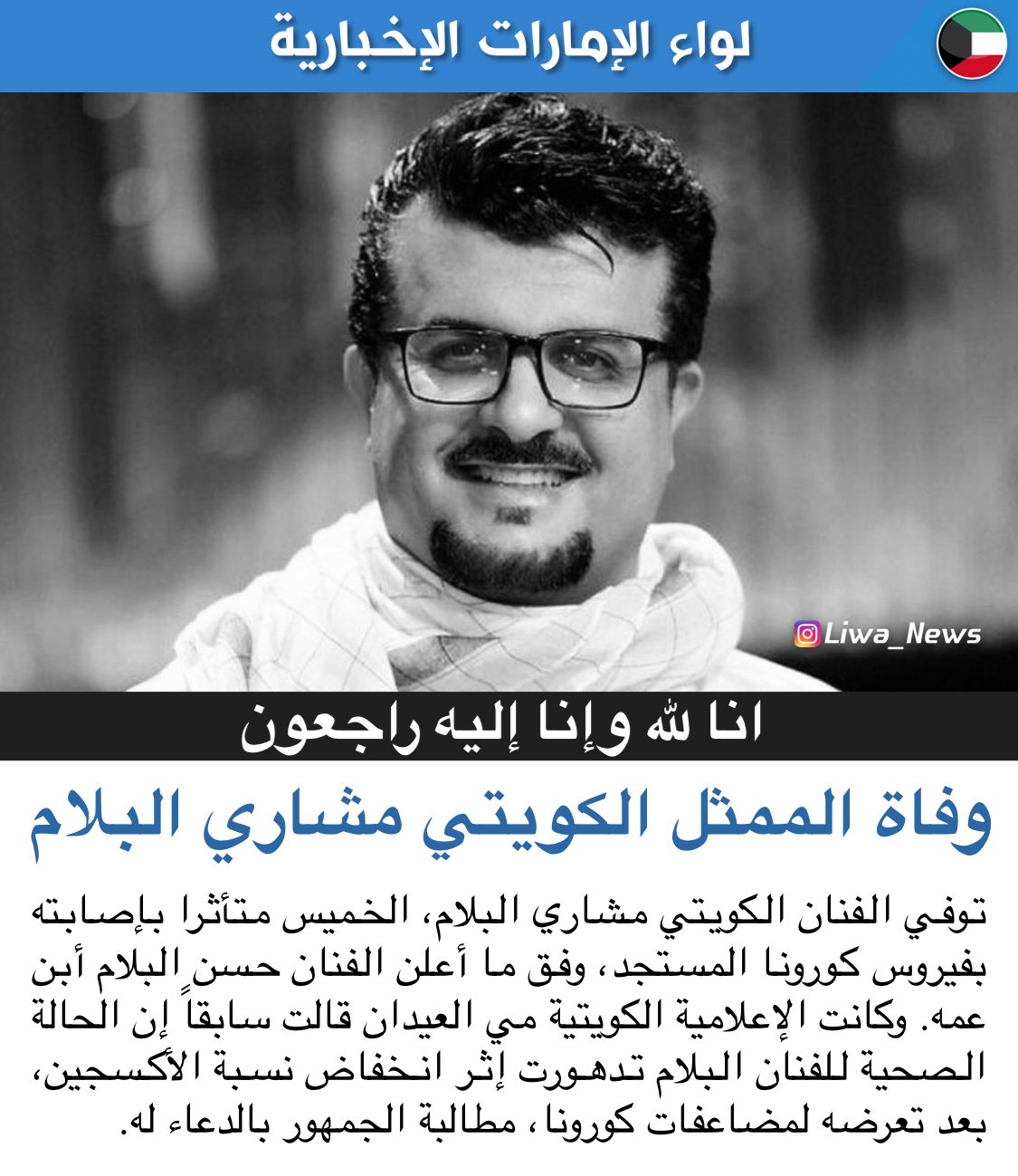 الممثل الكويتي مشاري البلام - Woafk9ast Q Bm. وفاة الممثل الكويتي مشاري البلام. توفي الفنان الكويتي الشهير، مشاري البلام، عن عمر يناهز 48 سنة، متأثرا بإصابته بفايروس كورونا المستجد، بعد مسيرة حافلة في التمثيل توجت بعشرات الأعمال. وتخرج مشاري البلام من كلية الدراسات التجارية في الهيئة العامة للتعليم التطبيقي. وهو أحد الوجوه التي برزت بقلم الكاتبة فجر السعيد ، كما أدى العديد من الأدوار المركبة مثل المصاب بالصرع في مسلسل دروب الشك والأصم الأبكم في مسلسل جرح الزمن. الممثل الكويتي مشاري البلام تلقى من حوالي ١٠ أيام الجرعة الأولى من لقاح كورونا وبعد ٥ أيام أعلن إصابته بكورونا ومبارح تم نقله إلى العناية المركزة بسبب نقص الأوكسجين…